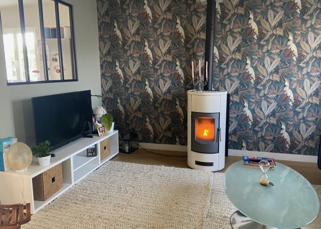 Quand je suis sur place je partage avec vous la pièce de vie et la cuisine aménagée et équipée, ouvrant sur un séjour chaleureux doté d’une télévision connectée et d’une authentique table de ferme. Pour des soirées encore plus agréables, un poêle à granulés est également à votre disposition.