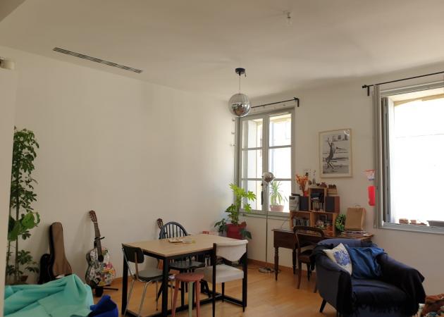 Appartement de 90m² avec un grand salon et une cuisine américaine équipée. Les toilettes sont séparées de la salle de bain.