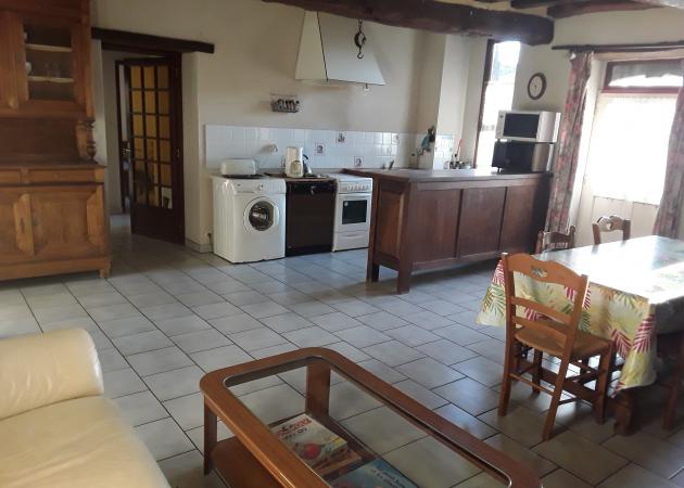 Maison de 90 m2 avec séjour cuisine, un canapé, 3 chs. dont 1 avec salle d'eau et wc privés.1 salle de bain et wc indépendants. Lave vaisselle, lave linge, micro-ondes. Salon de jardin et barbecue