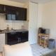 Cuisine ouverte sur le salon, équipée : petit réfrigérateur contenant une partie congélation, des plaques électriques, une hôte, une cafetière, un micro-onde et des ustensiles de cuisine.