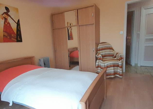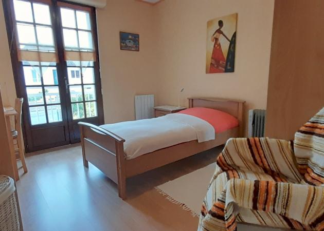 1) - Au mois ou, occasionnellement à la semaine : une chambre individuelle (lit 90 cm) de 12m2 meublée, lumineuse, petit balcon, salle de bains juste en face avec douche, lavabo, placard, WC séparés ;
