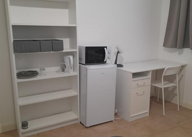 Vous disposerez également d'un frigo, d'un four à micro-ondes, d'une bouilloire avec de la vaisselle.