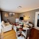 ~ pièce de vie : salon avec canapé, TV, étagères, table, chaises, etc.