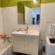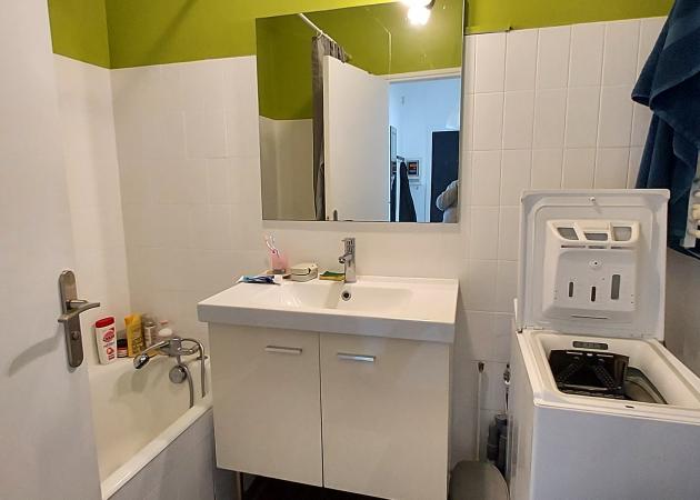 - Une salle de bain avec meuble vasque et lave-linge.