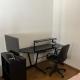 un bureau, salle de bain avec baignoire et machine à laver une kitchenette équipée dispose d’une machine à café.