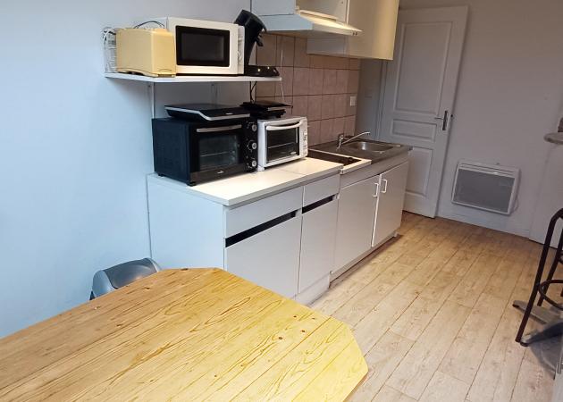 - Cuisine indépendante réservée aux locataires, toute équipée : Un Micro-Onde et deux fours électrique, grand frigo, plaques induction, bouilloire, cafetière et grille-pain, vaisselle et ustensiles