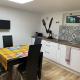 Cuisine équipée (plaques, réfrigérateur, micro onde, vaisselle, ustensiles) - Machine à café, bouilloire et grille pain.