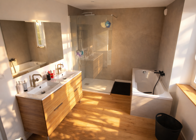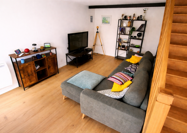 Accès aux pièces communes : cuisine, salle à manger, salon, salle de bains. Deux toilettes.