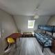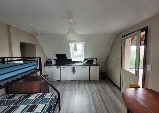 Un pièce principale avec un lit superposé 3 places, un canapé convertible, un table de déjeuner, un petit frigo, un plaque de cuisson et un micro-onde.