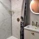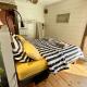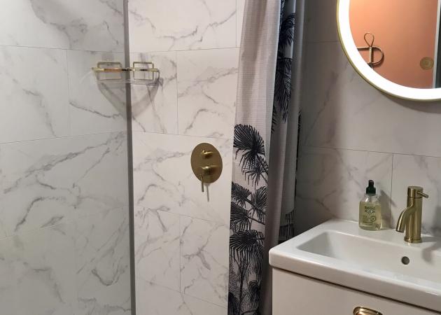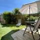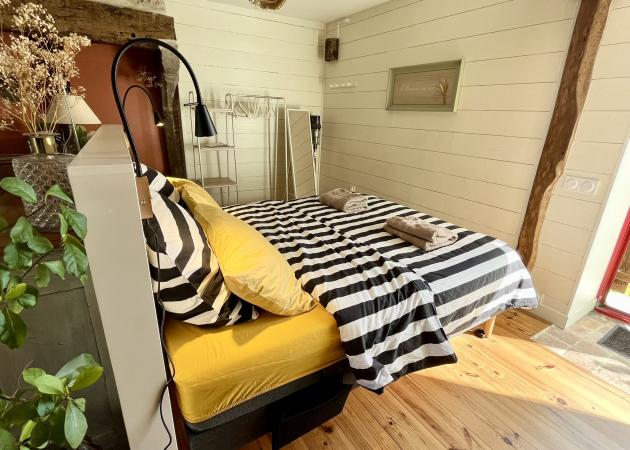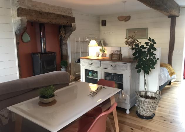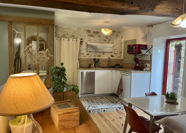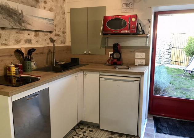 Il est composé d'une kitchenette avec : lave-vaisselle, cafetières, plaque induction, four micro onde et tout le nécessaire pour cuisiner (condiments, vaisselles,...); d'un coin salon avec canapé, TV; d'un lit confortable 160cm; d'une salle d'eau avec douche, wc, sèche cheveux.