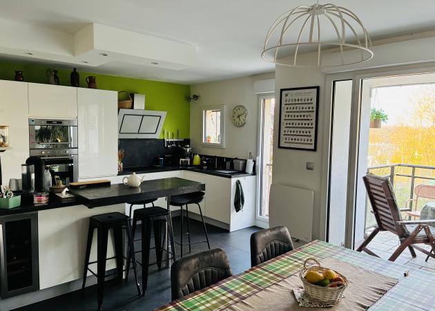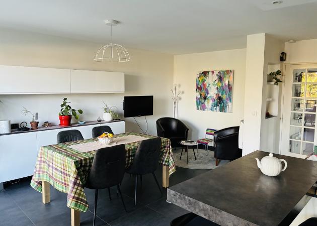 le rdc : pièce de vie commune lumineuse donnant sur le jardin avec cuisine tout équipée salle à manger et petit salon télé ,L’entrée et une buanderie .