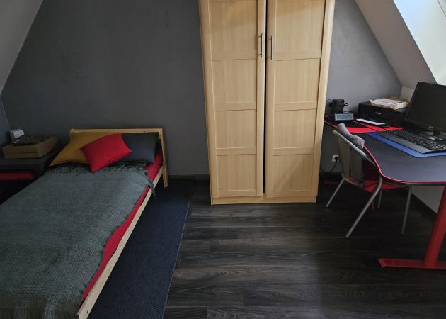 Chambre avec lit 1 personne pour étudiant. Avec armoire et bureau de travail.