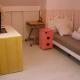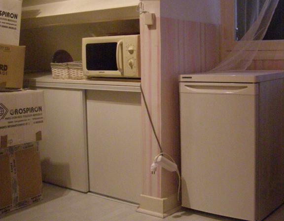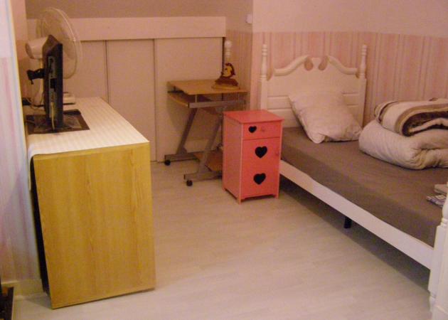 Elle contient 1 lit simple avec couette et oreiller neufs, 1 commode, 1 table+ 1 chaise, 1 petit chevet, 1 micro-ondes et plusieurs placards sous combles + petite vaisselle personnelle.