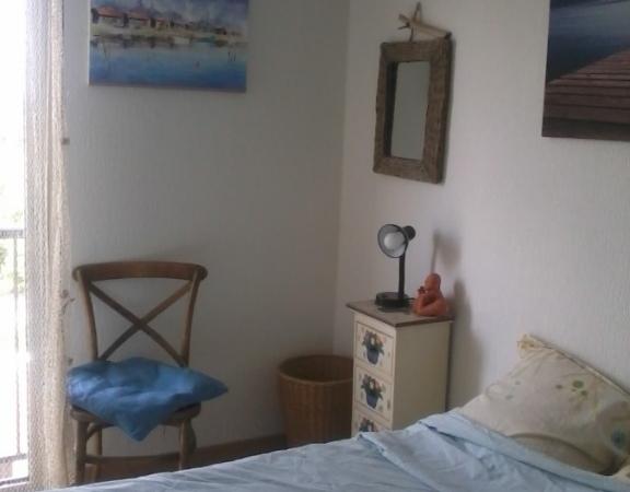 la chambre est à coté de la salle de bain : douche, lavabo, porte serviettes, place étagères et