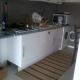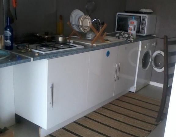 cuisine : machine à laver, plaque gaz, frigo, évier et égouttoir, mini four