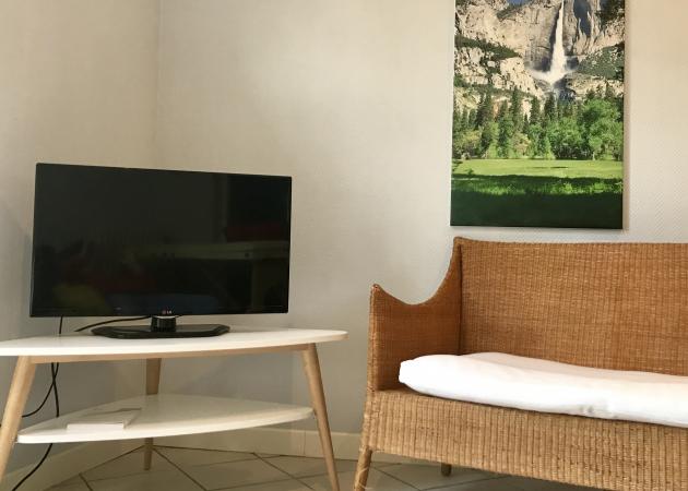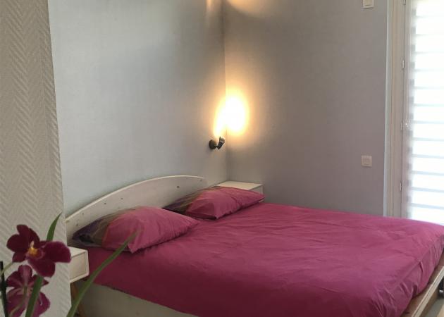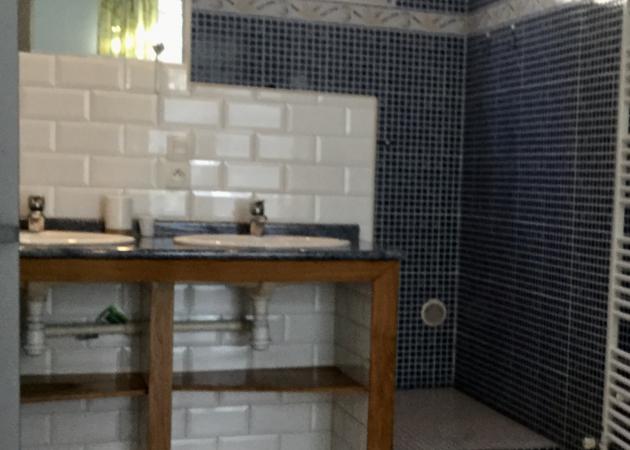 La chambre est équipée d'un lit de 1m40, d'un coin salon avec télévision , nombreux rangements, d'une baie vitrée donnant sur le jardin, petite terrasse privative , salle d'eau avec double vasques , douche à l'italienne et wc privatifs,