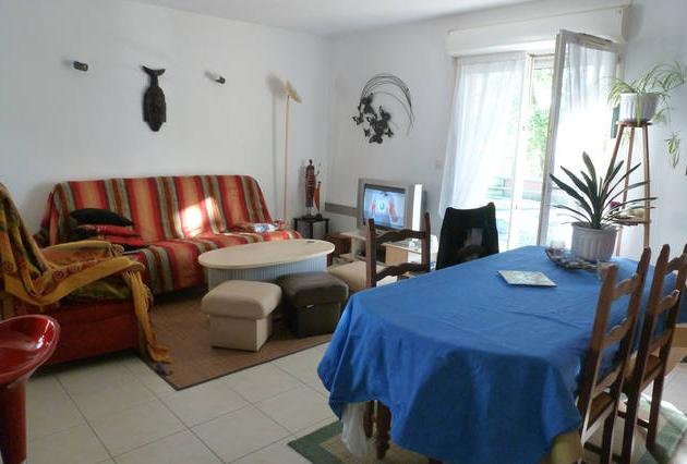 - le salon équipé (canapé, fauteuil, TV, internet, console de jeux) avec vue sur le balcon