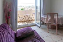 Chambre avec petite terrasse, spacieuse, belle vue, ensoleillee