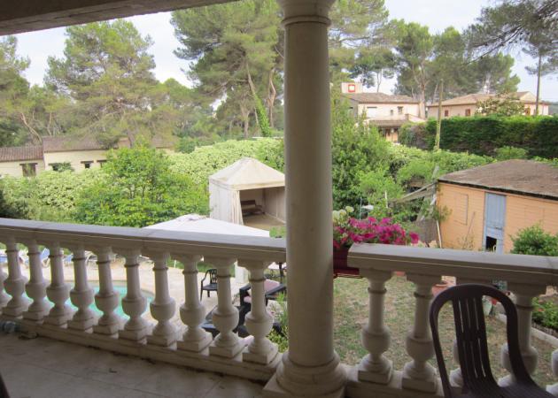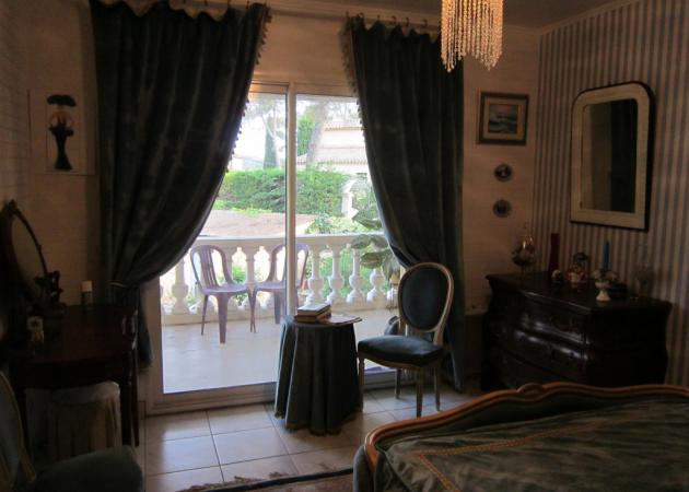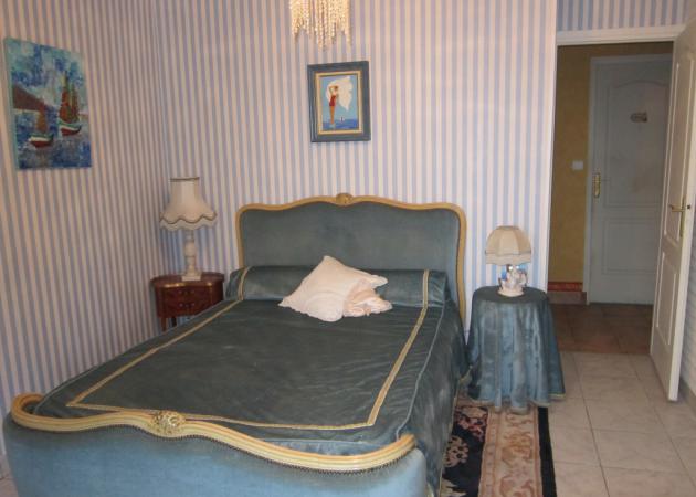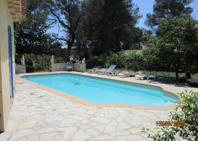 chambre dans villa ; lit pour 2 personnes avec salle de bain commune, avec terrasse car cette chambre se trouve a l'étage belle vue sur la piscine et le jardin très agréable possibilité d'une 3 eme personne car petite piece attenante avec un lit de 120 ou pour poser vos bagages