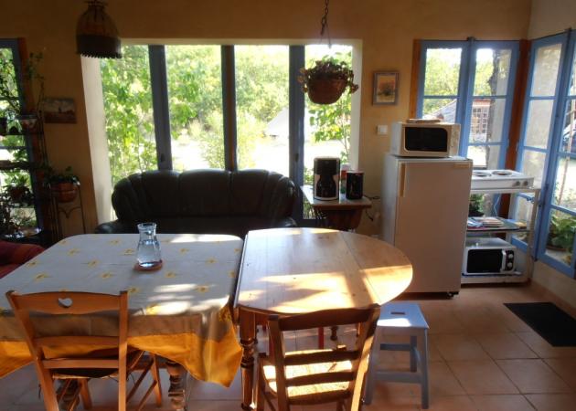 Local avec électricité, frigo, plaque chauffante, micro onde, cafetière, bouilloire, vaisselles, table, chaises.