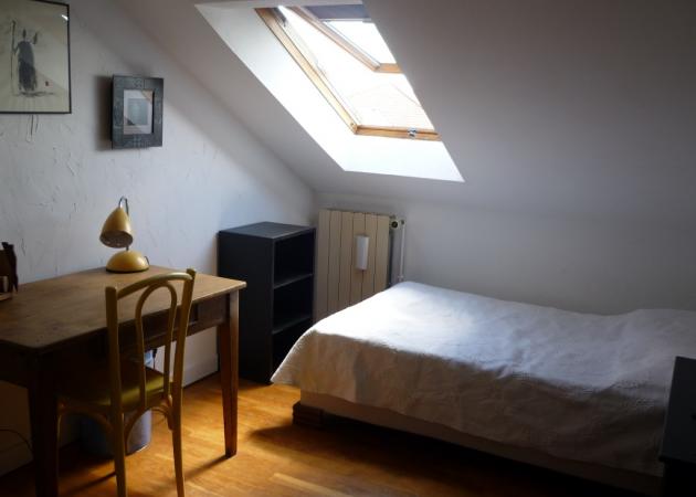 mansardée, fermant à clé, très claire, calme, WIFI, SDB et cuisine partagées.
