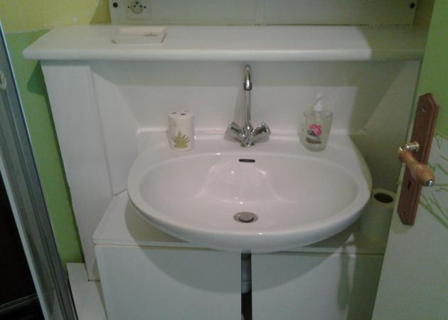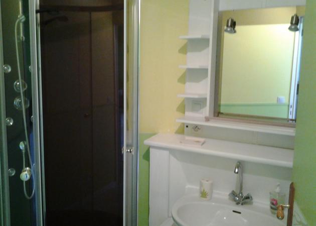 Une salle d'eau avec douche à jets massant, lavabo, WC, sèche cheveux, savon, étagères de rangements.