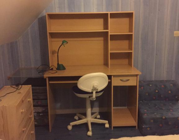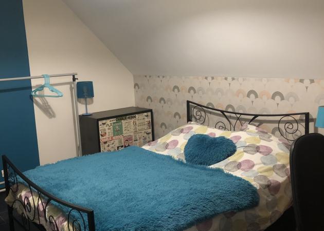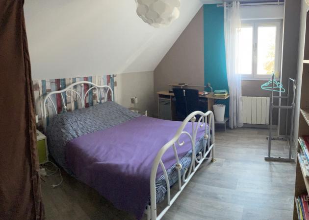 Chambre à l'étage d'une maison familiale équipée d'un grand lit d'un bureau et d'une armoire