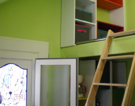 Idéal pour étudiant, apprenti ou stagiaire : Chambre indépendante chez l'habitant (12m²) en mezzanine avec kitchenette, coin bureau, coin repas, coin lavabo, salle d'eau (douche, WC).