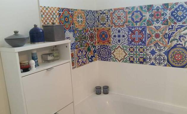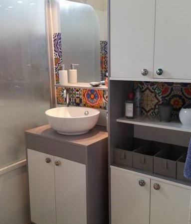 une salle de bains avec baignoire et ensemble de meubles neufs juin 2015 ;