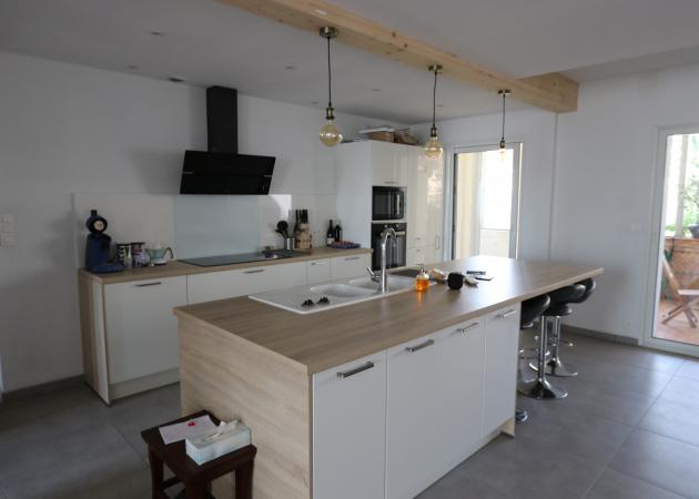 C'est une belle maison à la façade blanche, avec des hauteur sous plafond de 2.5 m, Les pièces sont spacieuses, la cuisine est tout équipé, salle de bain avec douche à l'italienne, WC séparé, belle terrasse avec BBQ, Machine à laver, sèche linge...