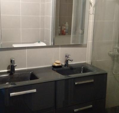 Appartement de 75m², grand salon avec télévision et bureau, salle de bain avec baignoire, hall ...