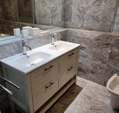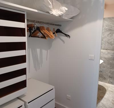 Grande chambre, toute équipée, bureau, lit, placards, étagères, douche, WC, coin cuisine, lavab...