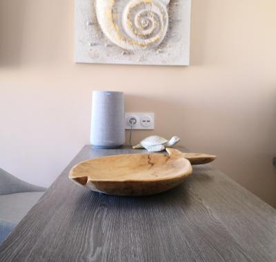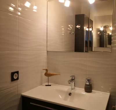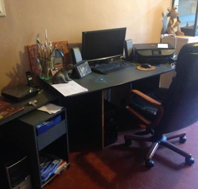 Appartement de 75m², grand salon avec télévision et bureau, salle de bain avec baignoire, hall ...