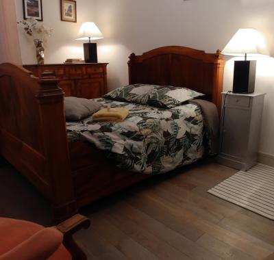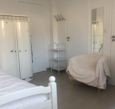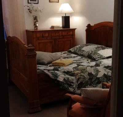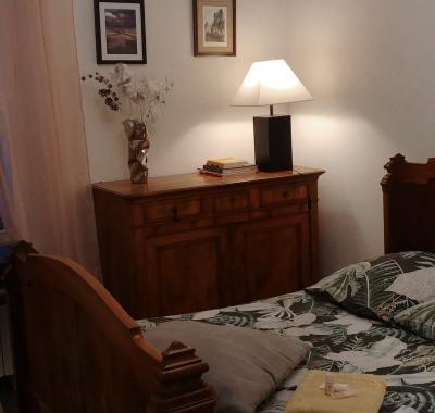 chambre rez-de-chaussée accès direct sur extérieur, salle de bain partagée. Lit de 140, penderi...