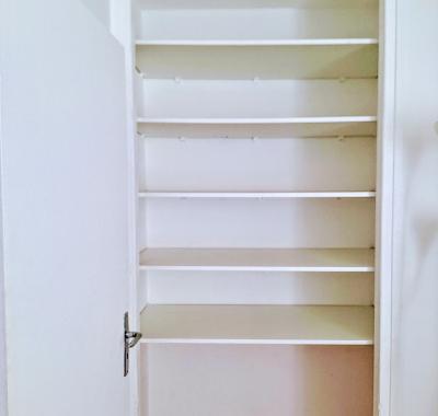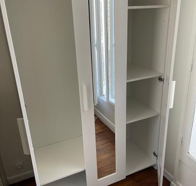 Chambre meublée avec lit et placard de rangement.