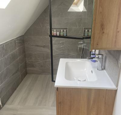 Chambre avec SDB privative avec douche, accès aux pièces communes de la maison : WC, living, c...
