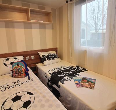 Chambre avec lit pour 2 personnes à l'étage, armoire et bureau.