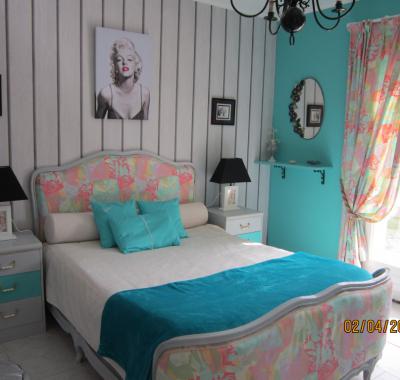 chambre dans villa ; lit pour 2 personnes avec salle de bain commune, avec terrasse car cette c...