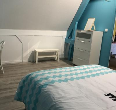 Chambre avec 1 lit 2 places, chevet, armoire et bureau, dans une maison et tout son confort. po...