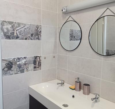 Appartement de 75m², grand salon avec télévision et bureau, salle de bain avec baignoire, hall ...
