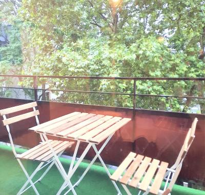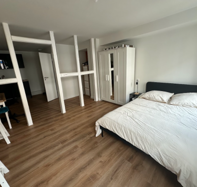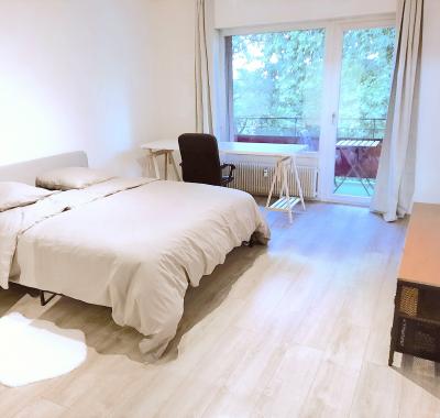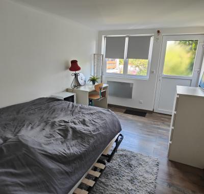 Chambre avec balcon de 5 m2, entièrement meublée, lit, chevets, bureau, siège, armoire et réfri...